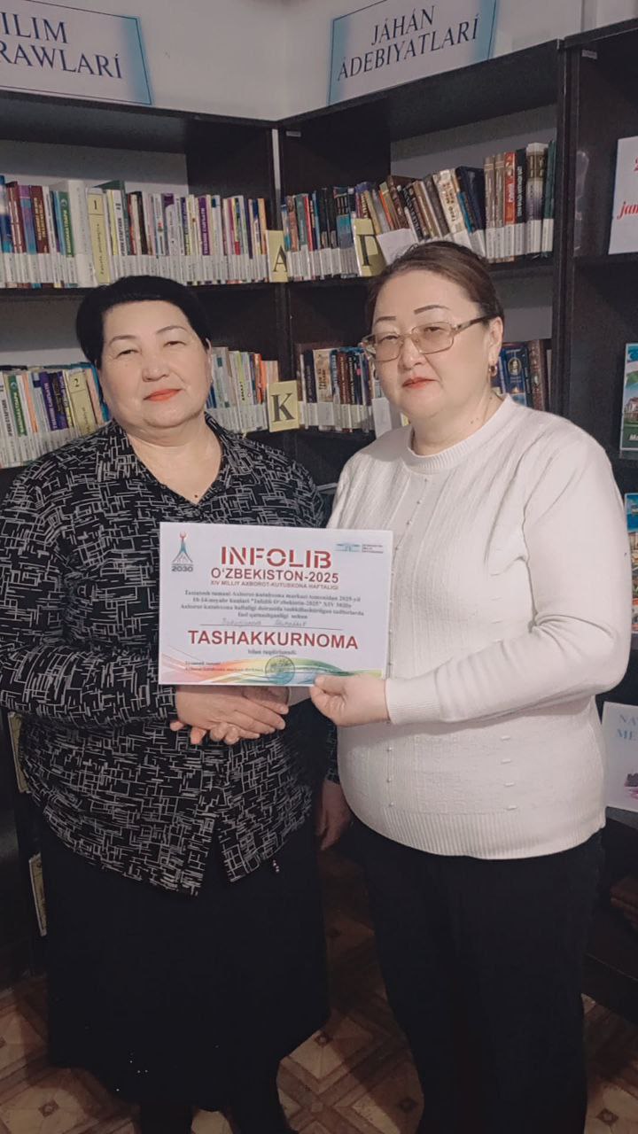 Joriy yilning 17-fevral kuni, Axborot-kutubxona markazi Abonomentlar va foydalanuvchilarga xizmat ko’rsatish xizmati raxbari J.Qadirbatva tomonidan “Kitobxon onalar” kuni munosabati bilan”Onalar va kitob nuri” mavzusida davra tashkillashtirildi. Bugungi davra suhbatimiz – mehmoni eng go‘zal va mazmunli qahram onlaridan biri Kitobxon ona — nafaqat oilada, balki mahallada ham kitob mutolaasini targ‘ib etib kelayotgan, farzandlariga ibrat bo‘layotgan, bo‘sh vaqtini kitob bilan mazmunli o‘tkazadigan, ma’naviy yetuk suxbatimiz mehmoni kitoxon ona Taxiatosh tumani 1-sonli Texnikum Axborot-kutubxona markazi kutubxona mudiri M.Babajanova. Bu tadbir — oilada kitobxonlik muhitini yaratishda, farzand tarbiyasida onaning o‘rni beqiyos ekanini yana bir bor e’tirof etish uchun bag‘ishlanadi.